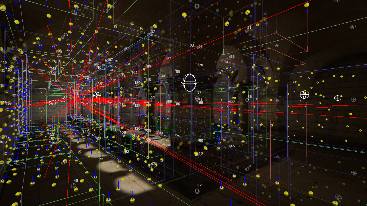 /// <summary>/// Update local probe indices based on camera position/// </summary>privatevoidUpdateLocalProbeIndices(){if(!_mainCamera||Probes==null||Probes.Length==0)return;Vector3cameraPos=_mainCamera.transform.position;// Only recalculate if camera has moved significantlyif(Vector3.Distance(cameraPos,_lastCameraPosition)<CameraMovementThreshold)return;_lastCameraPosition=cameraPos;_localProbeIndices.Clear();// Convert camera position to probe grid coordinates for more efficient distance calculationVector3gridPos=(cameraPos-transform.position)/probeGridSize;// Calculate distances from camera to all probes using grid coordinatesusing(ListPool<(intindex,floatdistance)>.Get(outvarprobeDistances)){for(inti=0;i<Probes.Length;i++){if(Probes[i]){// Calculate probe position in grid coordinatesVector3probeGridPos=(Probes[i].transform.position-transform.position)/probeGridSize;// Use squared distance for efficiency (avoiding sqrt)floatsqrDistance=(gridPos-probeGridPos).sqrMagnitude;probeDistances.Add((i,sqrDistance));}}// Sort by distance and take the closest onesprobeDistances.Sort(static(a,b)=>a.distance.CompareTo(b.distance));intcount=Mathf.Min(localProbeCount,probeDistances.Count);for(inti=0;i<count;i++){_localProbeIndices.Add(probeDistances[i].index);}}}