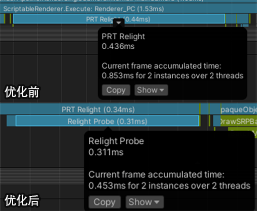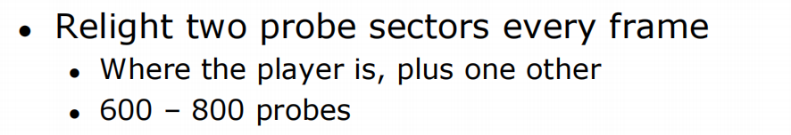 voidDoRelight(CommandBuffercmd,PRTProbeVolumevolume){volume.SwapCoefficientVoxels();// 如果是多帧Relight,则不需要清空体素if(!multiFrameRelight)volume.ClearCoefficientVoxel(cmd);// May only update a subset of probes each frameusing(ListPool<PRTProbe>.Get(outvarprobesToUpdate)){volume.GetProbesToUpdate(probesToUpdate);foreach(varprobeinprobesToUpdate){probe.ReLight(cmd,_relightCS,_relightKernel);}}// Advance volume render framevolume.AdvanceRenderFrame();}// 滚动获取当前帧要更新的ProbepublicvoidGetProbesToUpdate(List<PRTProbe>probes){for(inti=_currentProbeUpdateIndex;i<_currentProbeUpdateIndex+probesToUpdateCount;i++){probes.Add(Probes[i]);}}publicvoidAdvanceRenderFrame(){// Advance the update index for next frame_currentProbeUpdateIndex=(_currentProbeUpdateIndex+probesToUpdateCount)%Probes.Length;}