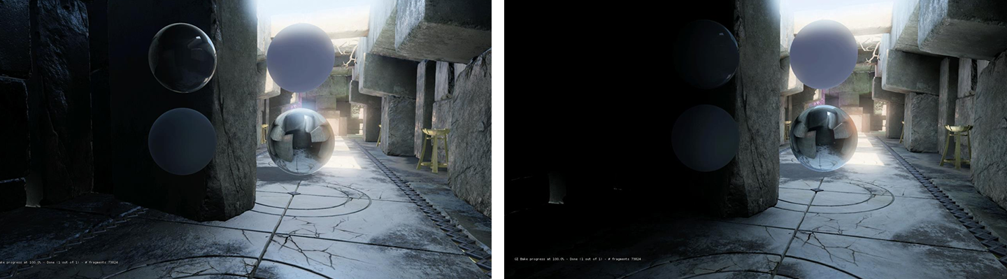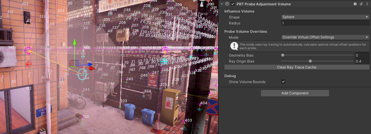 privateVector3CalculateRayTracedVirtualOffsetPosition(Vector3probePosition){constfloatDISTANCE_THRESHOLD=5e-5f;constfloatDOT_THRESHOLD=1e-2f;constfloatVALIDITY_THRESHOLD=0.5f;// 50% backface thresholdVector3[]sampleDirections=GetSampleDirections();Vector3bestDirection=Vector3.zero;floatmaxDotSurface=-1f;floatminDistance=float.MaxValue;intvalidHits=0;foreach(Vector3directioninsampleDirections){Vector3rayOrigin=probePosition+direction*rayOriginBias;Vector3rayDirection=direction;// Cast ray to find geometry intersectionif(Physics.Raycast(rayOrigin,rayDirection,outRaycastHithit,10f)){// Skip front facesif(hit.triangleIndex>=0)// Check if it's a valid hit{// Check if it's a back face by checking normal directionVector3hitNormal=hit.normal;floatdotSurface=Vector3.Dot(rayDirection,hitNormal);// If it's a front face, skip itif(dotSurface>0){validHits++;continue;}floatdistanceDiff=hit.distance-minDistance;// If distance is within thresholdif(distanceDiff<DISTANCE_THRESHOLD){// If new distance is smaller by at least threshold, or if ray is more colinear with normalif(distanceDiff<-DISTANCE_THRESHOLD||dotSurface-maxDotSurface>DOT_THRESHOLD){bestDirection=rayDirection;maxDotSurface=dotSurface;minDistance=hit.distance;}}}}}// Calculate validity (percentage of backfaces seen)floatvalidity=1.0f-validHits/(float)(sampleDirections.Length-1.0f);// Disable VO for probes that don't see enough backfaceif(validity<=VALIDITY_THRESHOLD)returnprobePosition;if(minDistance==float.MaxValue)minDistance=0f;// Calculate final offset positionfloatoffsetDistance=minDistance*1.05f+geometryBias;returnprobePosition+bestDirection*offsetDistance;}/// <summary>/// Get sample directions for ray tracing/// </summary>/// <returns>Array of normalized direction vectors</returns>privatestaticVector3[]GetSampleDirections(){// 3x3x3 - 1, excluding centerconstfloatk0=0f,k1=1f,k2=0.70710678118654752440084436210485f,k3=0.57735026918962576450914878050196f;returnnewVector3[]{// Top layer (y = +1)new(-k3,+k3,-k3),// -1 1 -1new(k0,+k2,-k2),// 0 1 -1new(+k3,+k3,-k3),// 1 1 -1new(-k2,+k2,k0),// -1 1 0new(k0,+k1,k0),// 0 1 0new(+k2,+k2,k0),// 1 1 0new(-k3,+k3,+k3),// -1 1 1new(k0,+k2,+k2),// 0 1 1new(+k3,+k3,+k3),// 1 1 1// Middle layer (y = 0)new(-k2,k0,-k2),// -1 0 -1new(k0,k0,-k1),// 0 0 -1new(+k2,k0,-k2),// 1 0 -1new(-k1,k0,k0),// -1 0 0// k0, k0, k0 - skip center position (which would be a zero-length ray)new(+k1,k0,k0),// 1 0 0new(-k2,k0,+k2),// -1 0 1new(k0,k0,+k1),// 0 0 1new(+k2,k0,+k2),// 1 0 1// Bottom layer (y = -1)new(-k3,-k3,-k3),// -1 -1 -1new(k0,-k2,-k2),// 0 -1 -1new(+k3,-k3,-k3),// 1 -1 -1new(-k2,-k2,k0),// -1 -1 0new(k0,-k1,k0),// 0 -1 0new(+k2,-k2,k0),// 1 -1 0new(-k3,-k3,+k3),// -1 -1 1new(k0,-k2,+k2),// 0 -1 1new(+k3,-k3,+k3),// 1 -1 1};}
